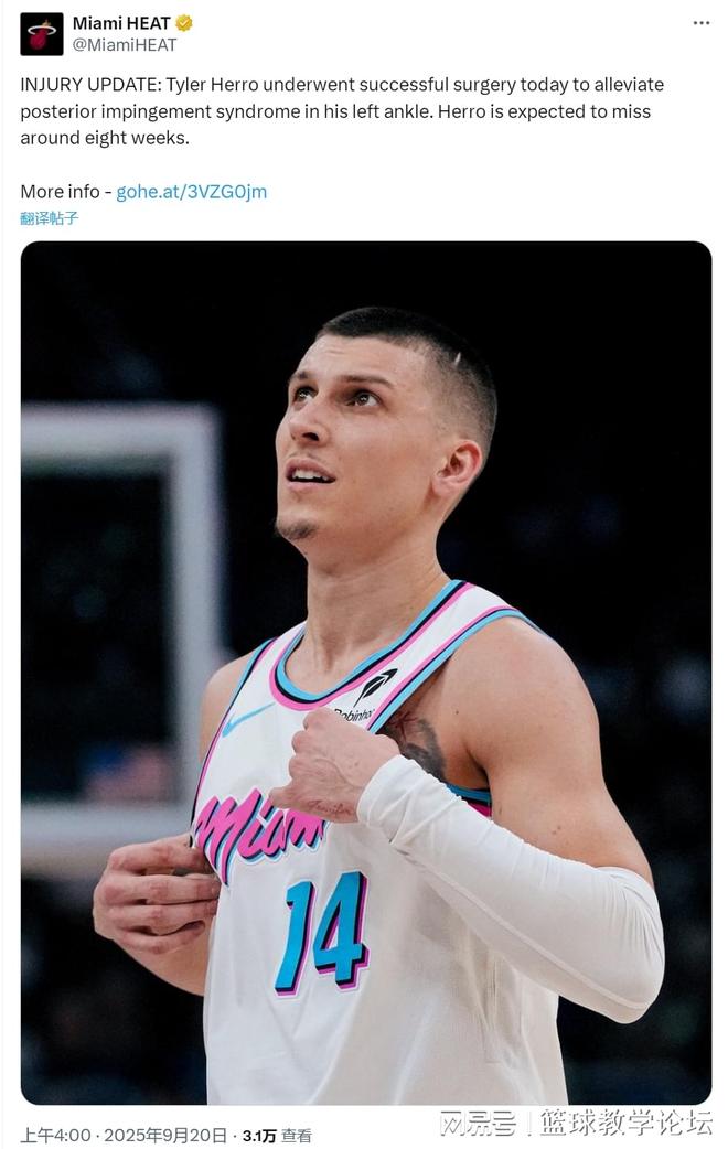 9月20日上午,热火突然宣布了他的伤口消息。泰勒英雄将脚踝手术留在左脚踝。