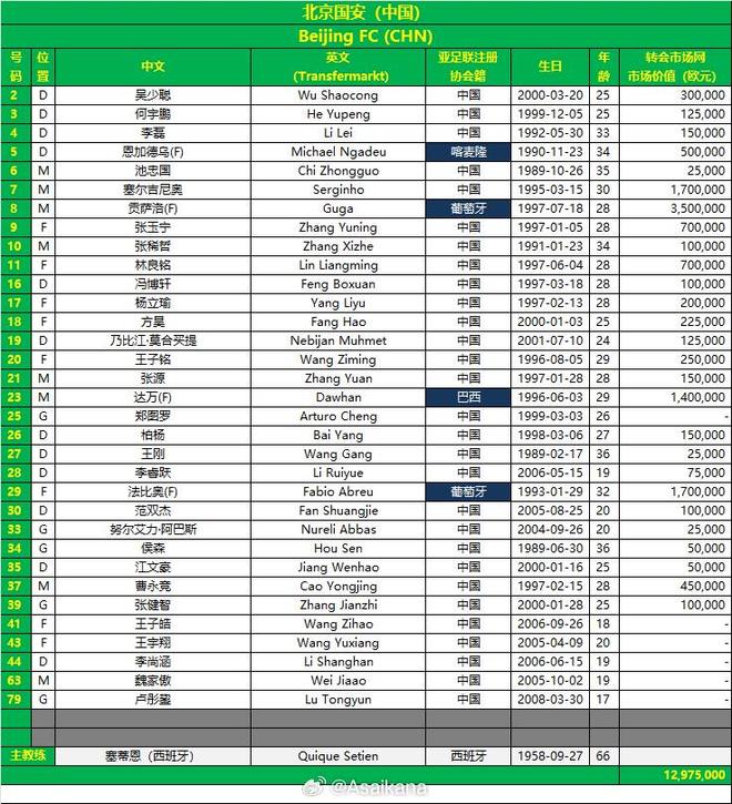 9月13日,德国转会市场亚洲地区的经理朱Yi宣布了他参与第二级AFC Champions联赛(小组阶段)的参与名单。 Beijing Guoan AFC Champions League 2-Wu Shaocong 3-He Yupeng 4-Li Lei 5-Engadewu (F) 6-Chi Zhongguo 7-Serginho 8-Guga (F) 9-Zhang Yuning 10-Zhang Xizhe 11-Lin Liangming 16-Yang 18-Fangi Ha Ha Ha Ha Ha Ha Ha Ziming 21-Zhang Yuan 23-Dawan (f) 25-zheng tuluo 26-bai Yang 27-wang gang 28-li ruiyue 29-fabio(f)30-fan shuangjie 33-nur ali-abbas 44-li上海63-wei jiaao jiaao 79-lu tongyan tongyan tongyan tongyan tongyan tongyan tong